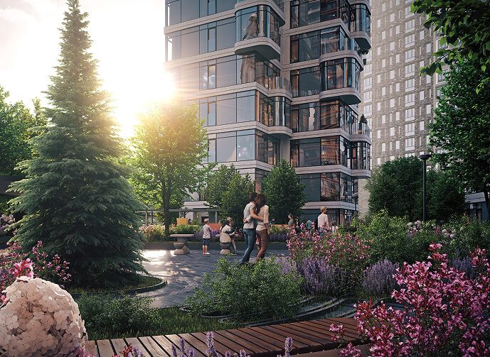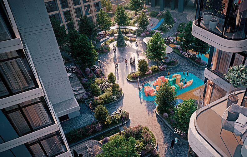 Двор проекта напоминает загадочный сад с извилистыми тропинками и уютными местами для отдыха. Пока дети строят песчаные замки и покоряют игровые лабиринты, взрослые смогут отдохнуть в тени или заняться йогой.